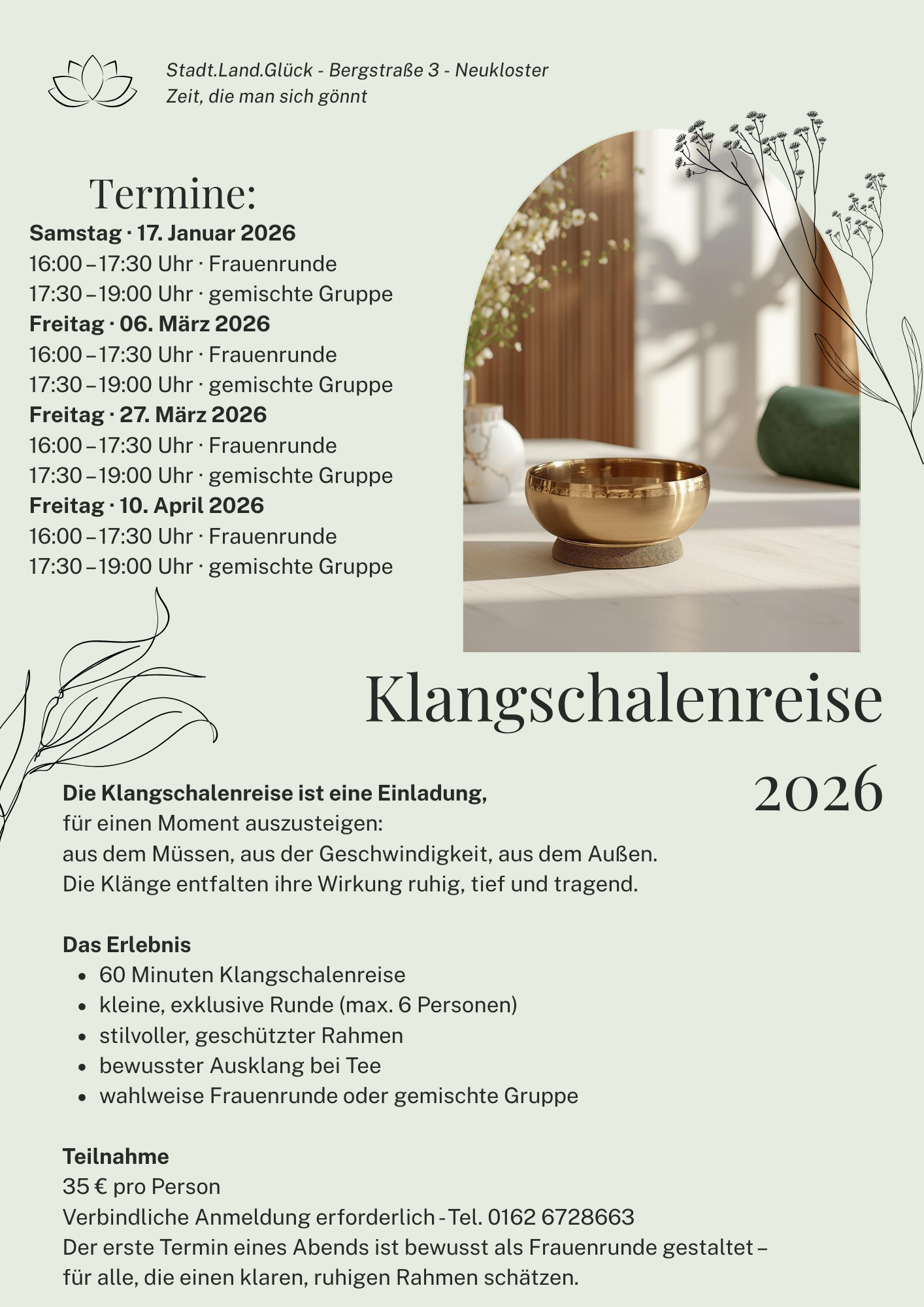 Die Klangschalenreise bei Stadt.Land.Glück ist ein geführtes Entspannungsangebot, das Körper und Geist in einen Zustand tiefer Ruhe führt. Die Teilnehmenden erleben eine etwa 60-minütige Klangreise, bei der sie liegend oder sitzend den Klängen und Schwingungen verschiedener Klangschalen lauschen können.